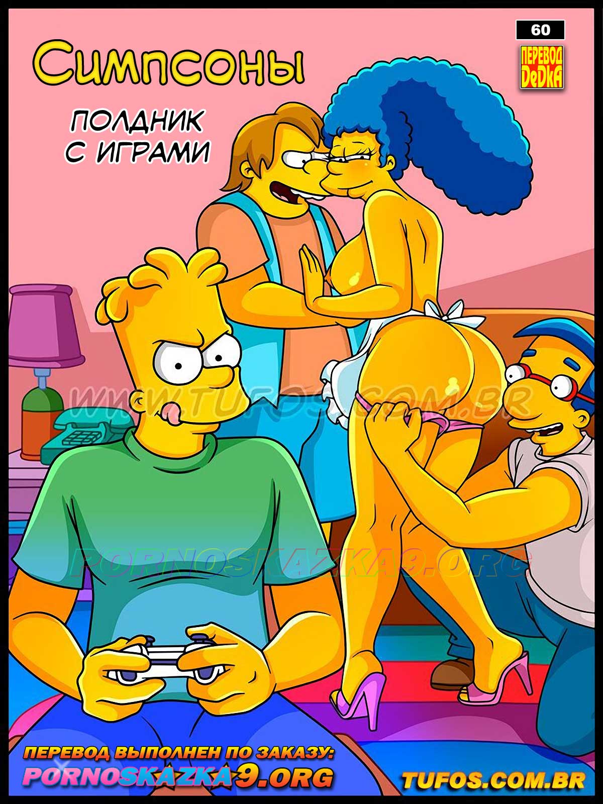 Порно комикс «Симпсоны. Часть 60. Полдник с играми». Барт пригласил своих друзей к себе домой на полдник с видеоигрой… Но Милхаусу и Нильсону вскоре становится скучно, так как Барт не хочет давать им в руки джойстик от новой PlayStation 5! Но игра принимает новый оборот, когда в гостиной появляется Мардж, чтобы предложить свою знаменитую закуску…
